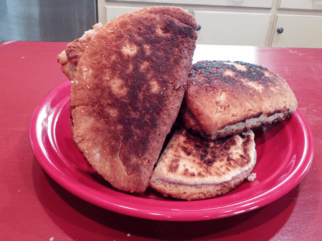 So the sweet potato and apple I cooked in the crockpot with brown sugar, cinnamon and nutmeg, vanilla extract and a little salt (to taste seems wrong to put here, but it will all depend on how many you are cooking plus how sweet they are and how sweet you want it… So “to taste” you can add more after they have cooked and you can taste them if they need it, but you can’t take it away so I start light)The crust is 3 cups self rising flour, 1/2 cup sugar, 1 tsp cinnamon and nutmeg,1 stick melted butter, and 1 cup milk. I rolled it as thin as I could and still work the dough without tearing and used a bowl as my biscuit cutter. Fill half the dough and fold it over and deal with a fork. I shallow fried mine for 2-3 minutes per side.