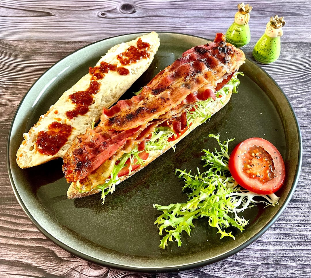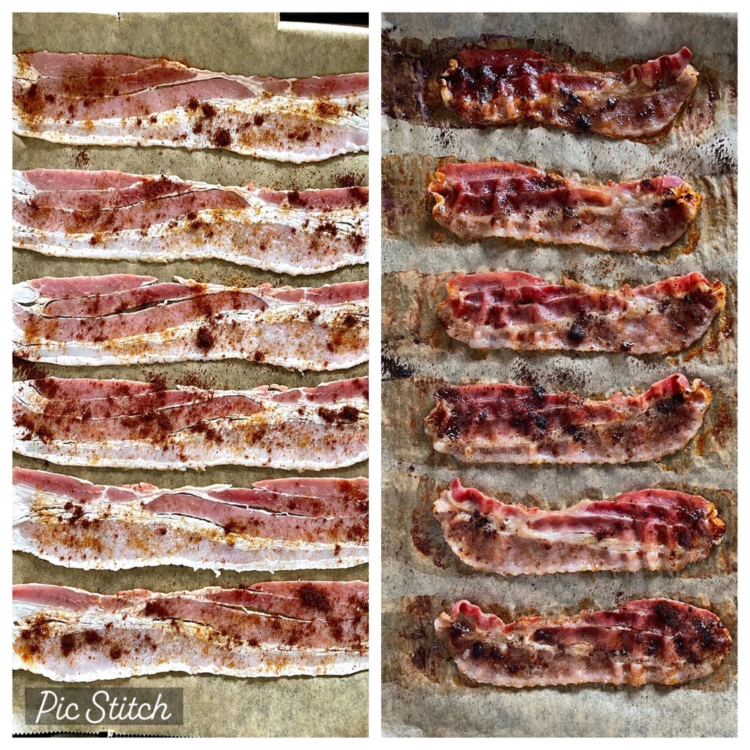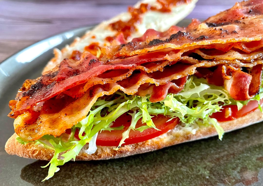 bacon dusted with brown sugar and jalapeño chili powder before baking, red habanero sauce added to mayonnaise on one side