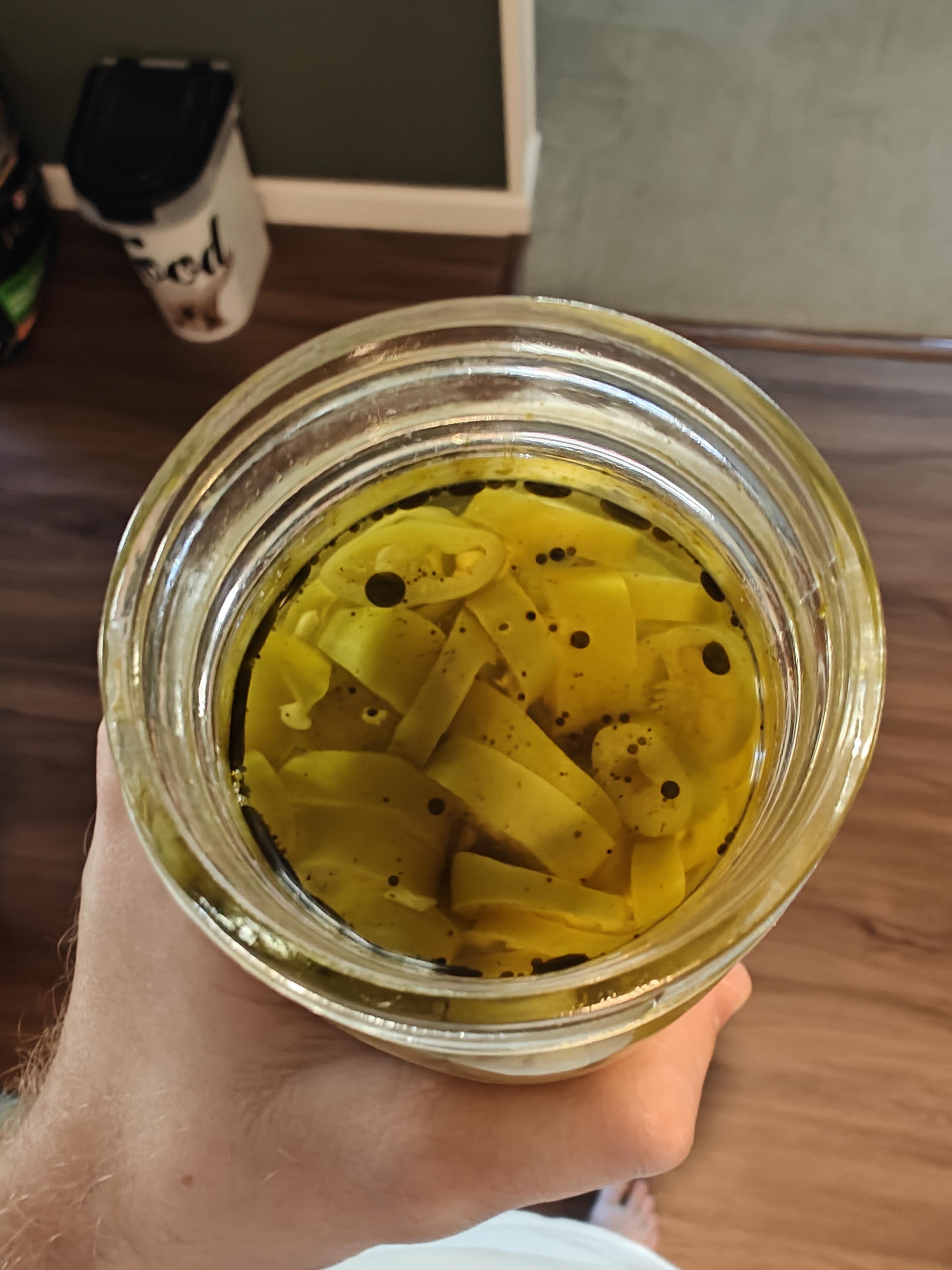 I’m not sure what recipe you’re talking about but if all that was in the jar was white vinegar and peppers, I sure wouldn’t eat them with all that black stuff.