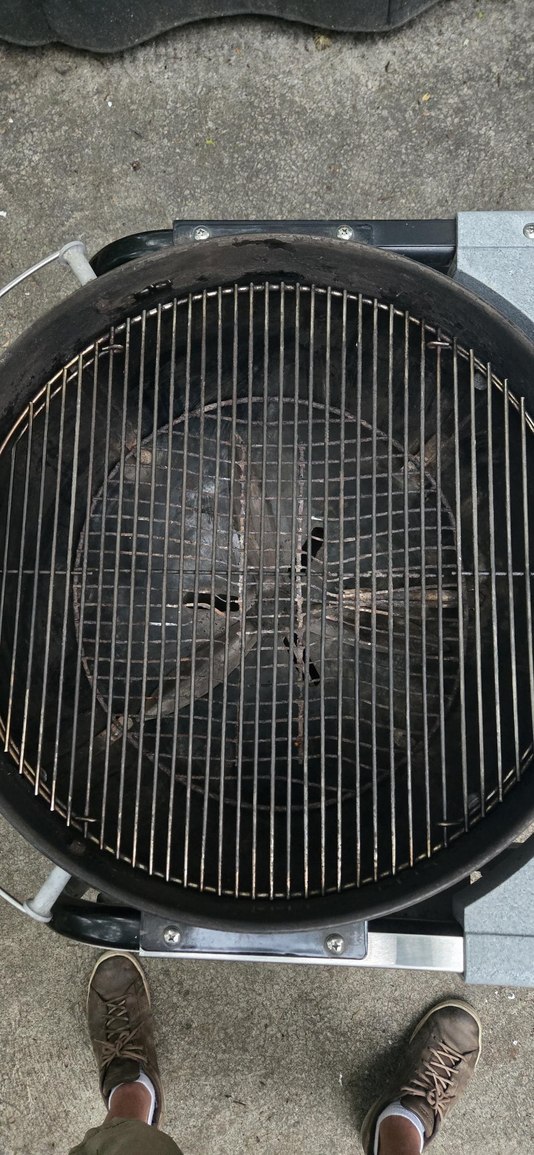Spent 2 hours cleaning her up this afternoon. The lower charcoal grate needs replacing, and the table is cracked a little around the 2 outside screws. But overall, in great shape. Any thoughts on how to remove the creosote buildup around the lip of the lid and base? Wondering if I took the torch to it, then hit it with a wire brush?